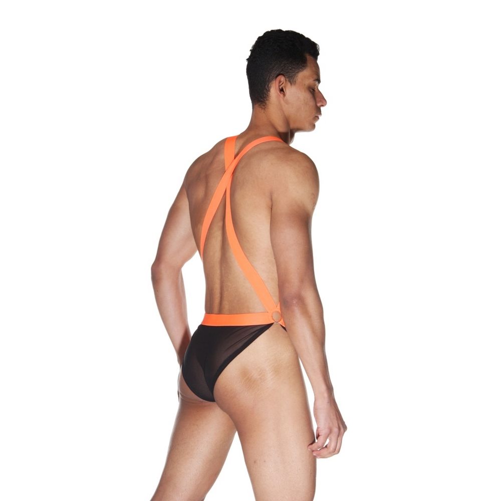 Слипы-боди для мужчин из черного полупрозрачного тонкого материала. Пояс и ремни оранжевого цвета.