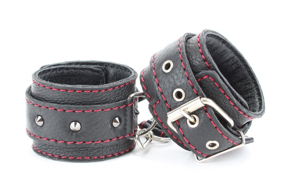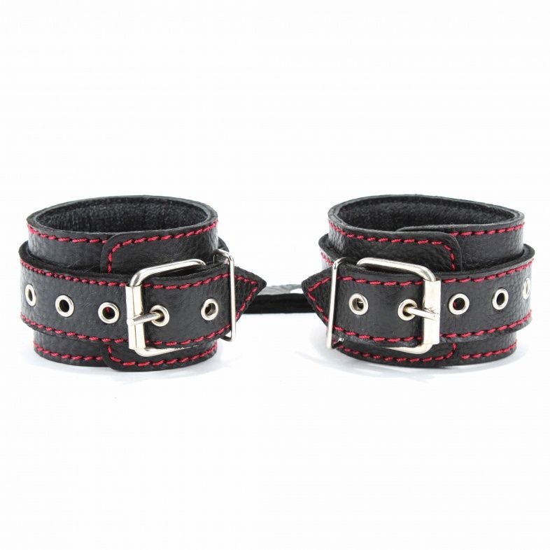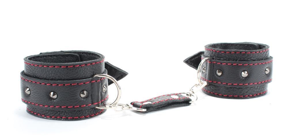 Оживить эротические игры Вам помогут поножи. Этот интимный аксессуар пользуется успехом. Выполненные в черном цвете с красной строчкой и украшены шипами. Модный интимный аксессуар не сдавливает и не нарушает кровообращение, так как изготовлен из мягкой кожи. Чтобы любимая никуда не убежала, поножи соединены короткой перемычкой. Длина перемычки - 6 см. Ширина оков - 5,3 см.
