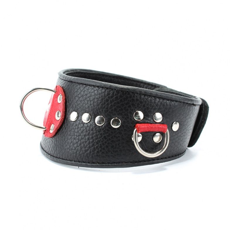 Изготовлен из натуральной кожи с металлическими заклепками. Размер универсальный. Кожаный ошейник - это один из основных атрибутов BDSM.